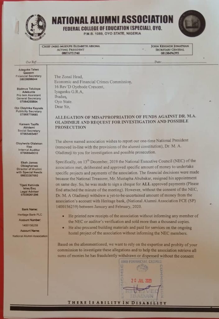 The National Alumni Association of the Federal College of Education (Special) in Oyo, Oyo State has petitioned the Economic and Financial Crimes Commission (EFCC) to investigate and prosecute her erstwhile National President, Dr. M.A Oladimeji, for fraud.