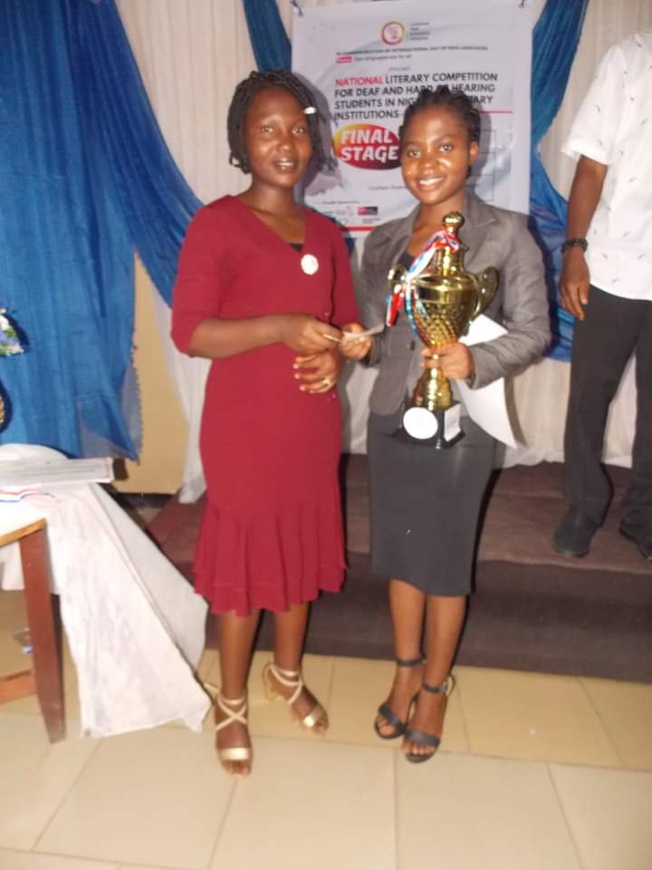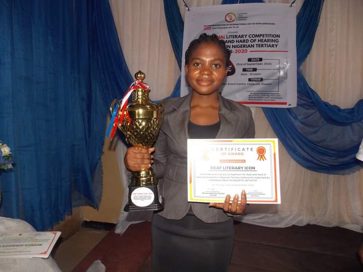 A final year student of the Department of Special Education, University of Ibadan, Miss. Aanuoluwapo Omoleye has emerged with the overall best performance in the first National Literary Competition for Deaf and Hard of Hearing Students in Nigerian Tertiary Institutions tagged NLCD 2020.