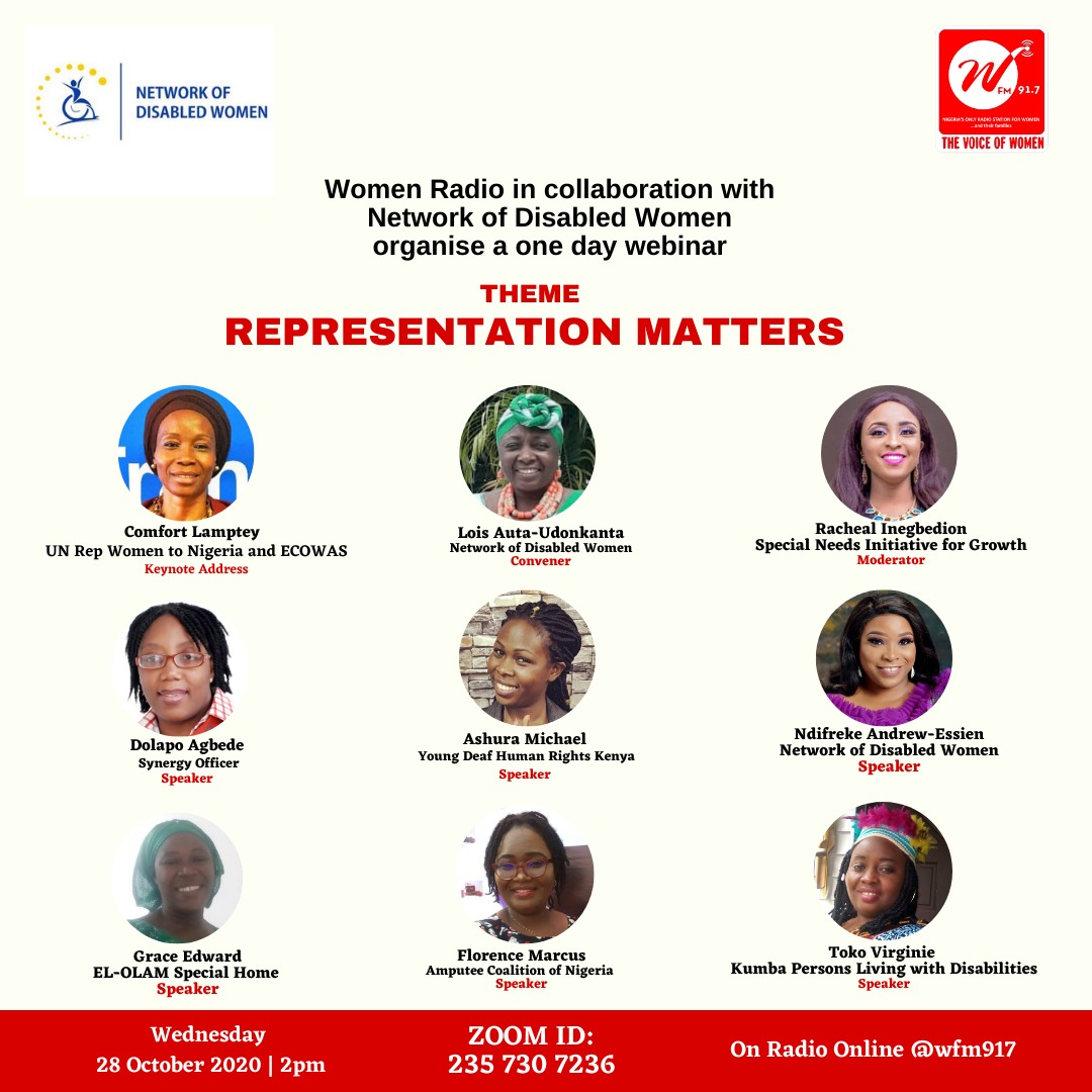 The Virtual Convention titled “Representation Matters” was put together with the aim of bringing stakeholders together to deliberate on issues hindering the participation of PWDs in the social, economic and political growth of the Nation. It brought together key personalities from the public and private sector. The event was held on 28th of October 2020 on Zoom.