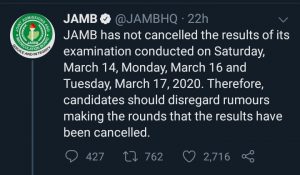 JAMB, in a statement on Wednesday via its verified Twitter handle, also refuted reports that it has canceled the results of examinations held on Saturday, March 14, Monday, March 16, and Tuesday, March 17, 2020.