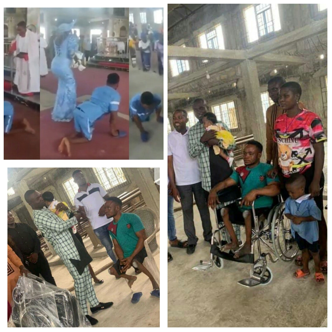 An emotional video of a physically challenged man crawling and dancing with his wife in church during dedication of their baby went viral on the net yesterday. Any thoughtful observer would wonder why the man had to go through the stress and embarrassment of crawling when there was the more dignifying option of mobility via wheelchair. This consideration probably prompted the Pastor of the church to purchase a brand new wheelchair for the man.