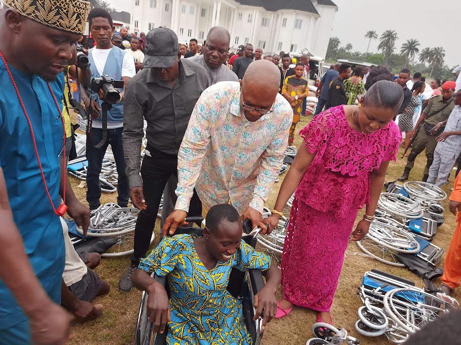 Delta State Commissioner for Energy Jonathan Ukodhiko has presented food items, wheelchairs, wrappers and other materials worth millions of naira to over 3,000 persons drawn from Isoko North and Isoko South Local Government Areas of the state.