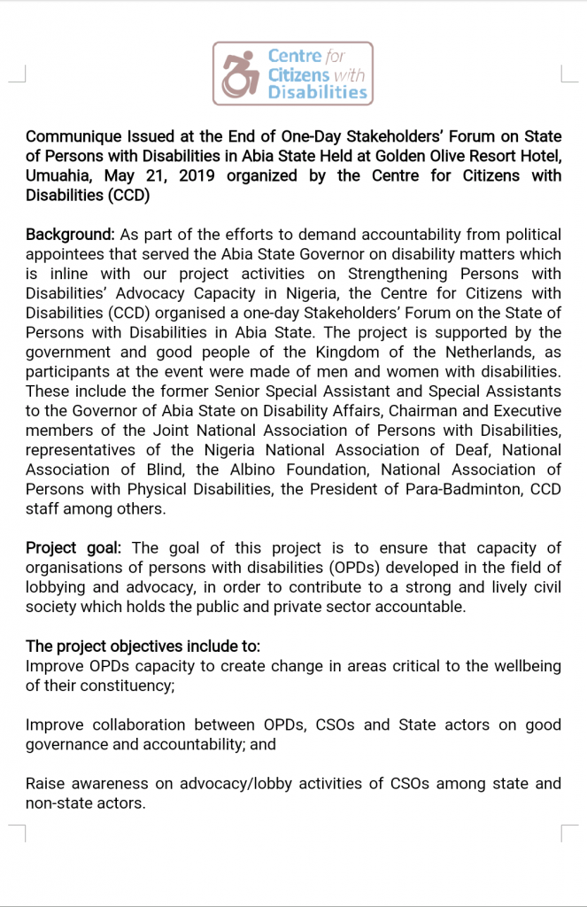 The Center for Citizens with Disabilities (CCD) has expressed its dissatisfaction with the Abia State Government over the state’s handling of matters relating to persons with disabilities in the state. The CCD expressed this dissatisfaction during its One-Days Stakeholders’ Forum on State of Persons with Disabilities in Abia State Capital, Umuahia on May 21, 2019.
