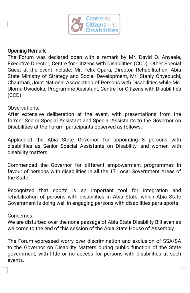 In the communiqué sent to Inclusive New Network after the stakeholders’ forum, the dissatisfaction of the CCD includes non passage of Abia State Disability Bill by the Abia State House of Assembly. Also in its complaint is the discrimination and exclusion of SSA/SA to the Governor on Disability Matters during public functions of the State government, with little or no access for persons with disabilities at such events.