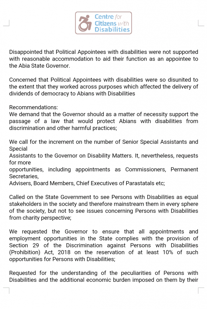 The CCD further called on Governor Okezie Ikpeazi of the Abia State to immediately support the passage of the disability law as it will protect the Abians with disabilities from discrimination and other harmful practices. It urged the governor to increase the number of disability persons that are Senior Special Assistants and Special Assistants to the Governor on Disability Matters as well as called on the State Government to see Persons with Disabilities as equal stakeholders in the society and therefore mainstream them in every sphere of the society, but not to see issues concerning Persons with Disabilities from charity perspective.