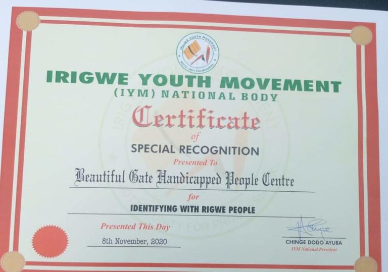 In appreciation of his immense contributions and impacts to the Irigwe Nation, the Executive Director of Beautiful Gate Handicapped People Centre Jos, Chief Ayuba Burki Gufwan today received a Medal of Appreciation from the Irigwe Youths Movement (IYM) National Body.