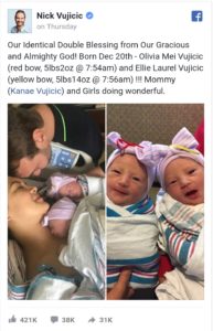 Motivational speaker, and evangelist Nick Vujicic and his wife are currently in a celebratory mood. The couple recently welcomed their second and third children, twin girls, Olivia and Ellie. Nick took to his Facebook page to share the good news. Read his post below: “Our Identical Double Blessing from Our Gracious and Almighty God! Born Dec 20th – Olivia Mei Vujicic (red bow, 5lbs2oz @ 7:54am) and Ellie Laurel Vujicic (yellow bow, 5lbs14oz @ 7:56am)!!! Mommy (Kanae Vujicic) and Girls doing wonderful.”