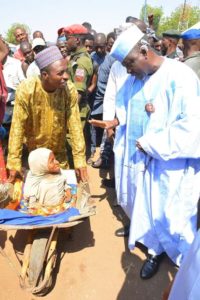 Gov. Almakura spoke to a 25-year-old Fatima Musa- the disabled woman on the wheelbarrow. Originally from Bauchi, the beggar and mother of two who had deformed limbs was shown an act og genority by the givernor. the Governor gave Fatima some money and then asked her if there was anything he could do for her.