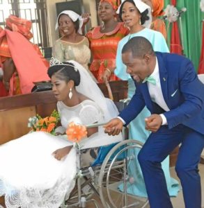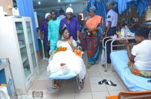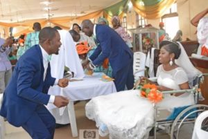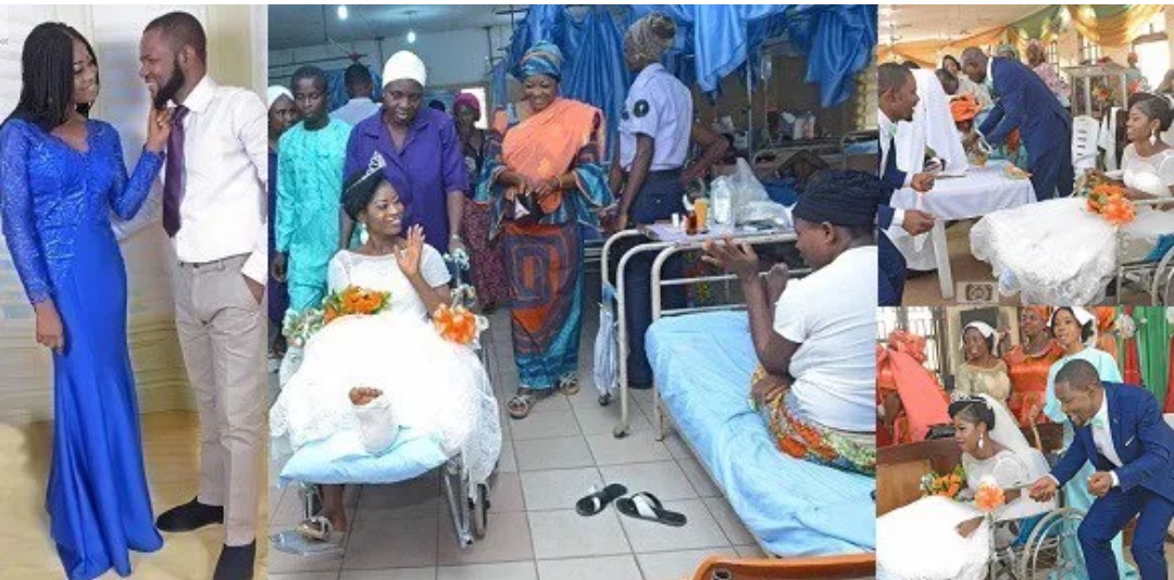 A Nigerian bride who was involved in accident few weeks to her wedding, leaves the hospital ward in a wheelchair to have her wedding. (Photos)