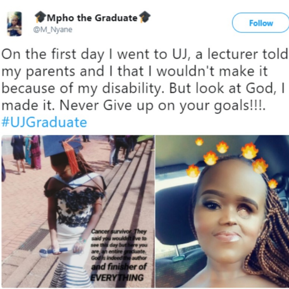 The lady who is known by her Twitter name as @M-Nyane took to her Twitter page to celebrate her graduation from university.