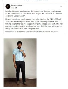 “Familiar Grounds Media would like to send our deepest condolences to the family of AKALI MATHEW, who played the character of DARENG on the TV Series HALITA. He was one of our much-valued cast, who died on the 24th of March 2020. This unfortunate event took place suddenly while he was filming on another set for an Epic movie in a village near Keffi. This has come as a rude shock to us all, and we pray that the Lord will grant his family the fortitude to bear this significant loss. From all of us at Familiar Grounds, we say Rest in Power “DARENG “